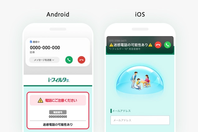迷惑電話の可能性がある番号からの着信時に、画面に警告を表示します。