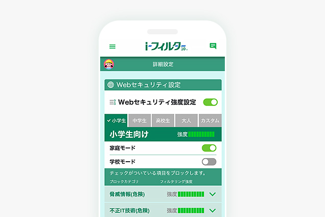 新登場の「i-フィルター 10」は、従来のお子さま向け「フィルタリング機能」に加え、大人やシニアもご利用いただける総合セキュリティ機能を搭載し、インターネットをより安全にお使いいただけるようになりました。