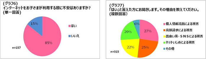 お子さまのインターネット利用について、85%の保護者が不安を感じており、その内訳は「個人情報流出による被害」(27%)、「高額請求による被害」(25%)、「出会い系・SNSによる被害」(22%)、「ネットいじめによる被害」(20%)の順になりました。
